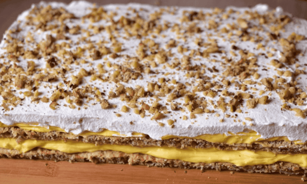 - Викладіть крем на торт і посипте крупно подрібненими волоськими горіхами. Нарізаємо порційним шматочками і подаємо до столу.