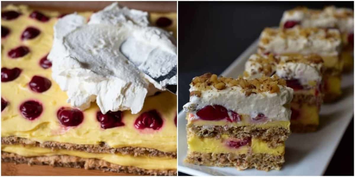 Оригінальне поєднання, але надзвичайно смачне. Коржів з волоським горіхом, тонким лимонним кремом, кисло-солодкою вишнею та збитими вершками – це надзвичайно смачний торт.