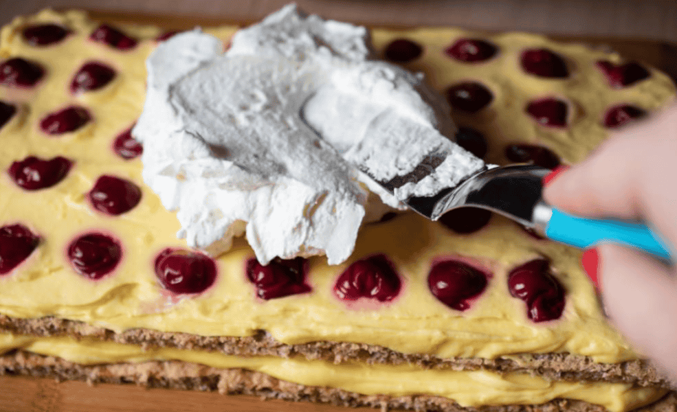 - Поверх першої половини кладемо крем, потім половину вишні.