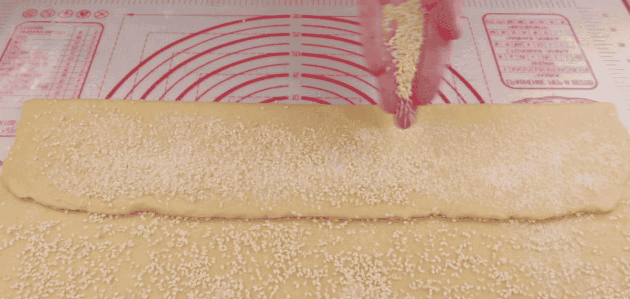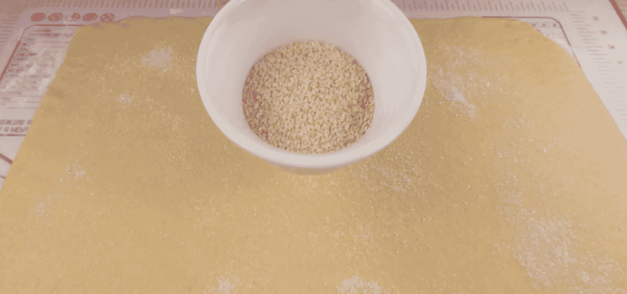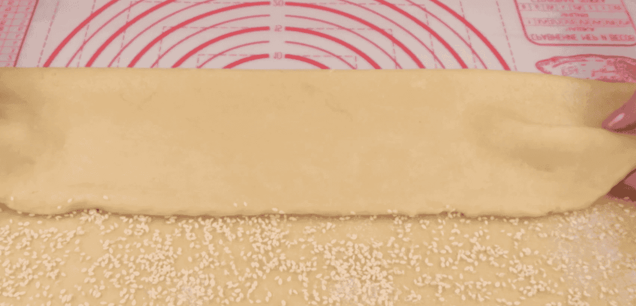 Розкачую тісто у прямокутний пласт. Товщина пласта приблизно 3 мм. Посипаю зверху цукром і висипаю кунжут.