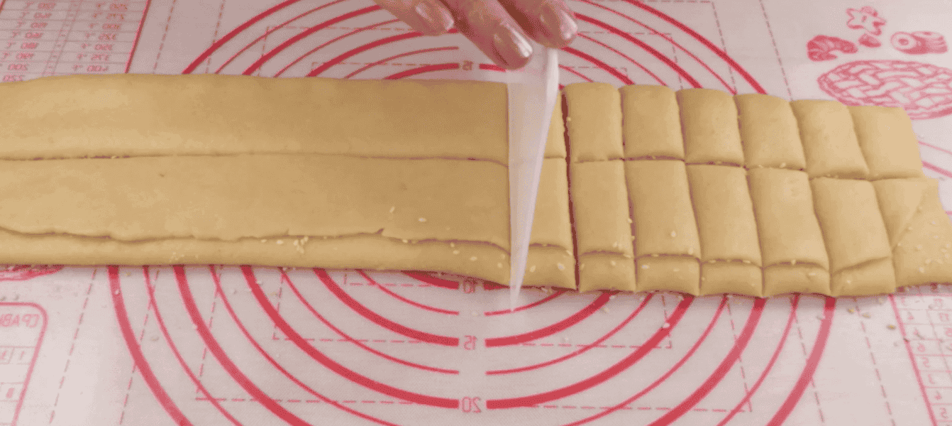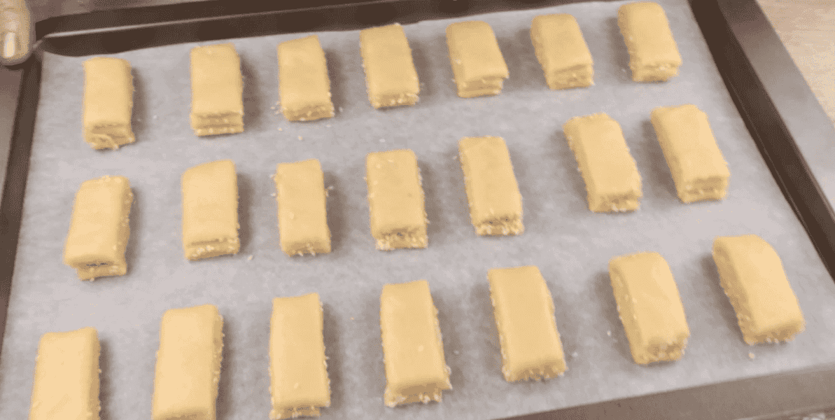 Розділяю пласт на дві частини та кожну нарізаю на невеликі прямокутники. Ширина приблизно 2,5 см.