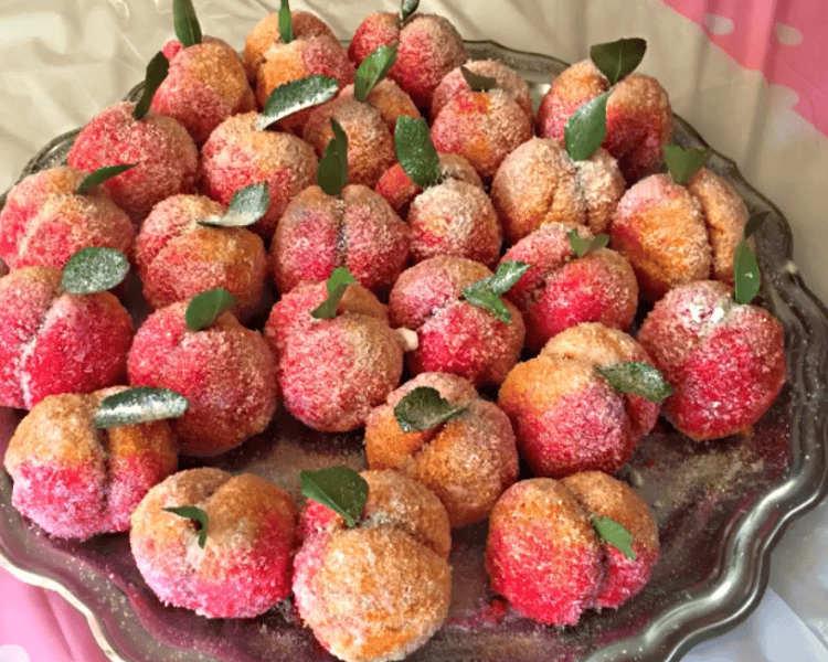 - Далі кожен персик занурюємо однією стороною в помаранчевий колір, інший в червоний, потім відразу ж обвалюємо в цукрі.