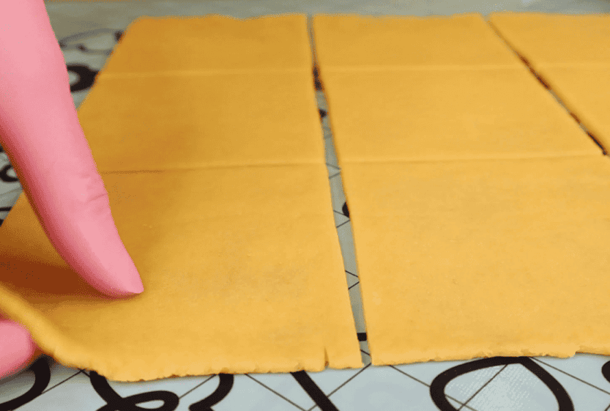 - Тісто розгортаємо у прямокутний пласт 30х20 см. Ділимо на 15 квадратів.