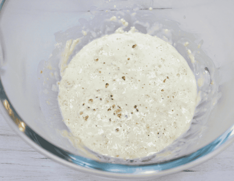 Приготуємо опару. У мисці для замішування тіста змішати тепле молоко, цукор (1 ч. л.) від загальної кількості, дріжджі, борошно (4 ст. л. з гіркою) від загальної кількості. Накрити плівкою та дати дріжджам активуватися.