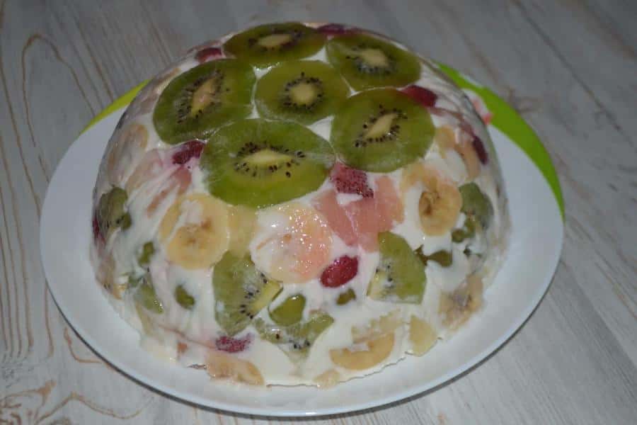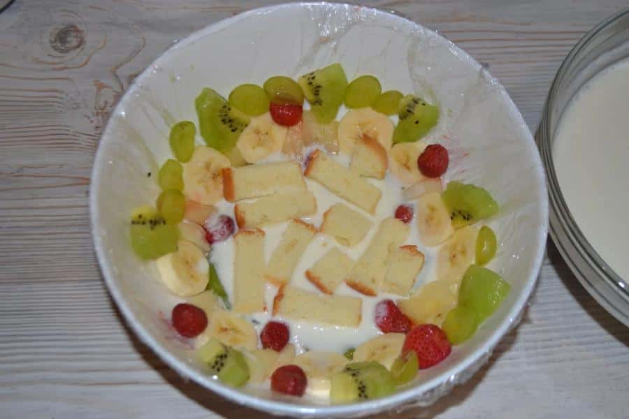 - Заливаємо кремом і так повторюємо шари: крем, бісквіт, фрукти крем і т. д., поки не закінчаться всі інгредієнти.