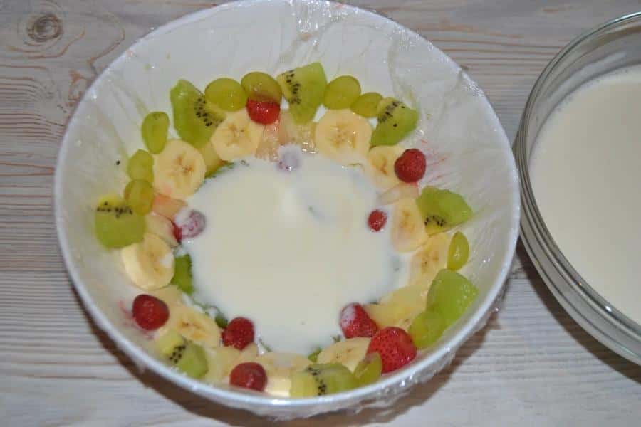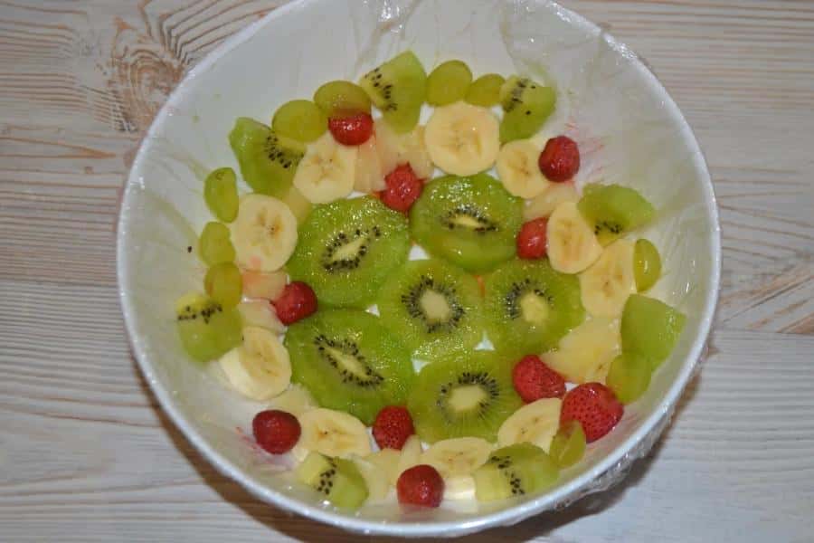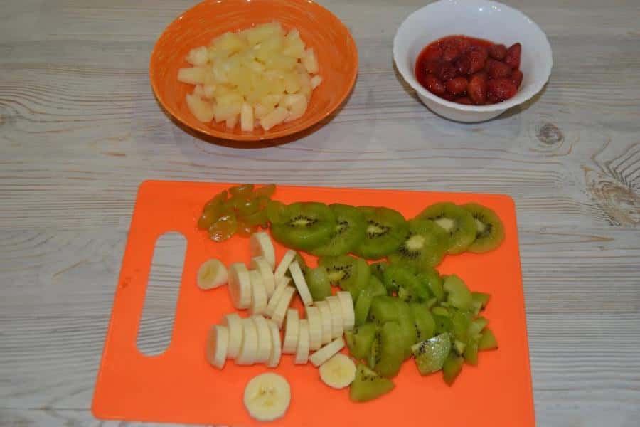 - фрукти: 1 банан, 2 ківі, 100 г замороженої полуниці, 250 г консервованих ананасів, жменя винограду або за смаком
