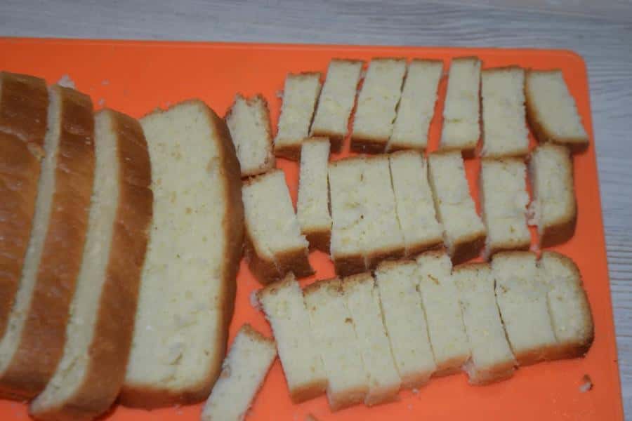 - Бісквіт дістанемо з форми і дамо трохи охолонути, потім нарізаємо невеликими довільними шматочками: брусочками, кубиками, як хочете.