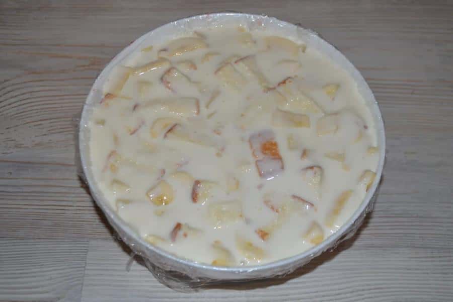 - Зверху накриваємо харчовою плівкою та прибираємо в холодильник до повного застигання, краще на ніч. Перед подачею торт перевертаємо на тарілку, прибираємо харчову плівку. Тортик готовий, приємного чаювання!
