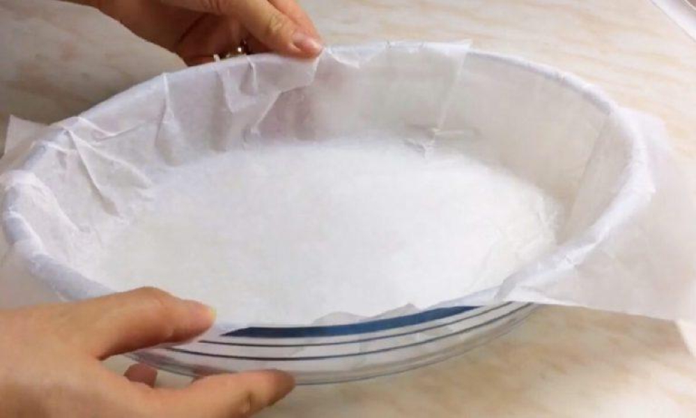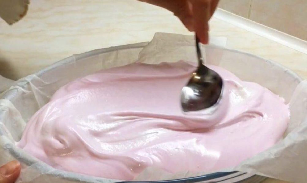 Підготуйте форму з високими бортами: застеліть харчовою плівкою і змастіть олією або використовуйте силіконізований папір для випічки. Перекладіть збиту масу у форму та розрівняйте ложкою.