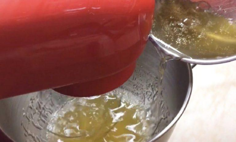 Почніть збивати желатин на середній швидкості міксера, поступово вливаючи гарячий сироп тонким струмком.