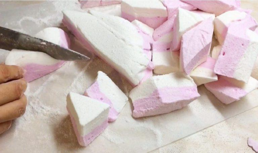 Приготуйте суміш із крохмалю та цукрової пудри в пропорції 1:1. Переверніть застиглий маршмеллоу на посипаний сумішшю папір для випічки і наріжте на шматочки. Обваляйте кожен шматочок у суміші, щоб вони не злипалися.