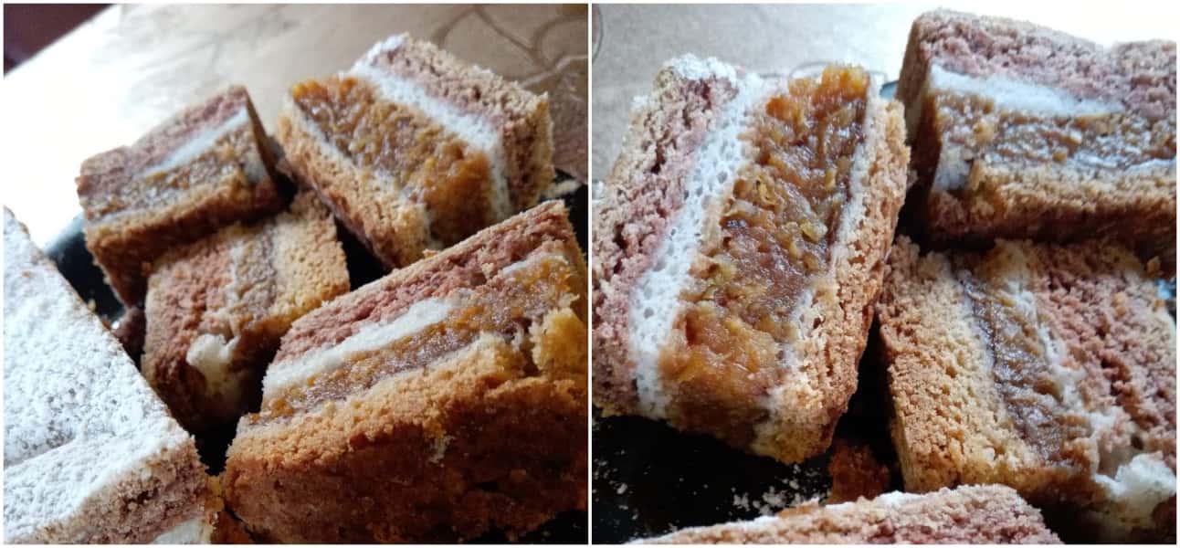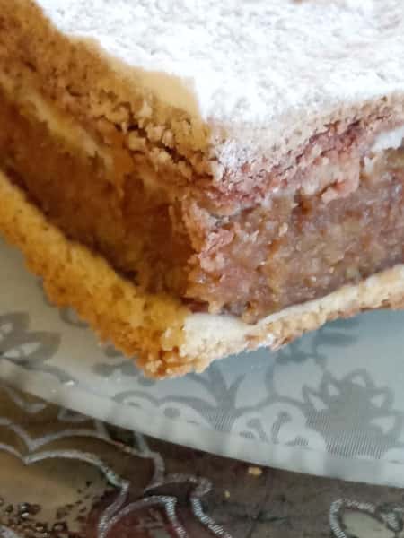Дістаємо з холодильника білу частину тіста, розкачуємо на робочій поверхні посипаній борошном,викладаємо на противню застелену пергаментом, потім викладуємо яблучну масу, рівномірно розрівнюємо, тоді акуратно, легенько викладуємо білкову масу, розрівнюємо, тоді розкачуємо коричневе тісто викладуємо на білкову масу, проколюємо пиріг по всій поверхні виделкою.