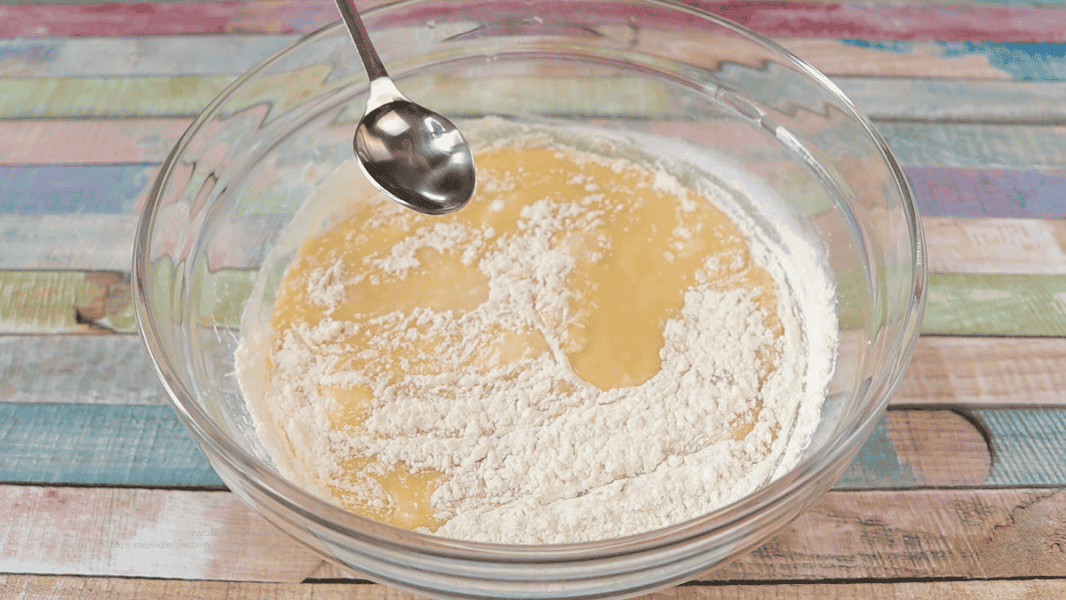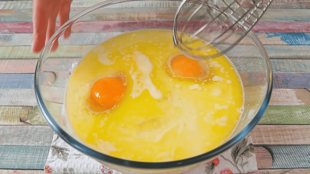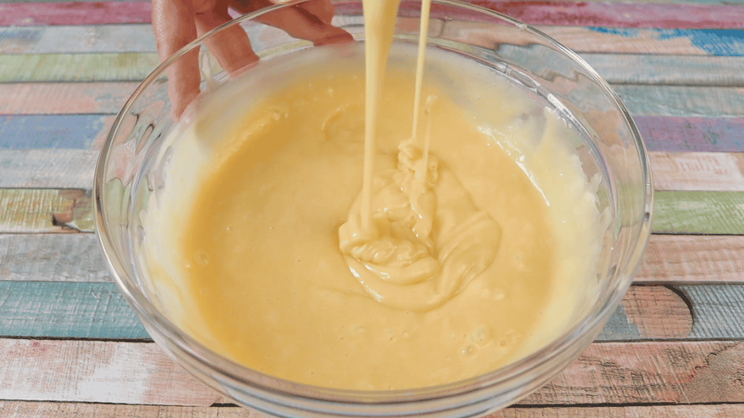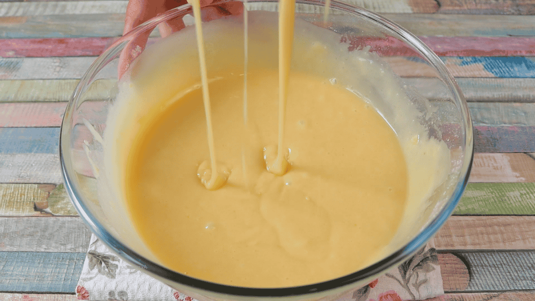 У миску просіюємо 300 г борошна, додаємо 1,5 ч. л соди і 0,3 ч. л солі. Далі в цю ж миску додаємо 2 яйця, 280 мл молока, 200-300 г цукру за смаком, 60 мл рафінованої олії, 60 г розтопленого вершкового масла. Перемішуємо вінчиком до однорідної консистенції без грудочок. Готове тісто рідке.
