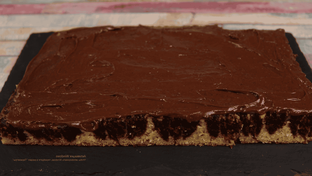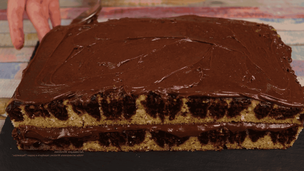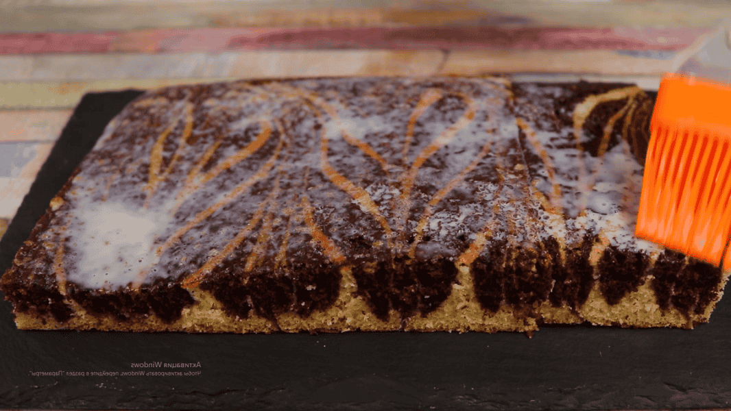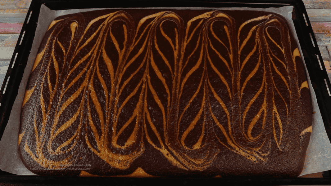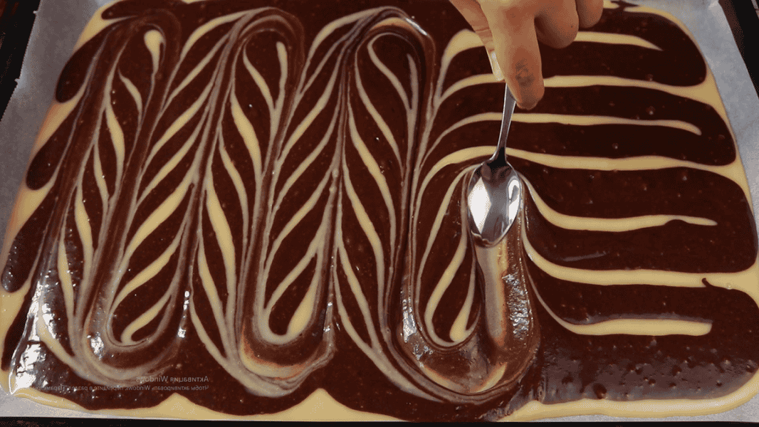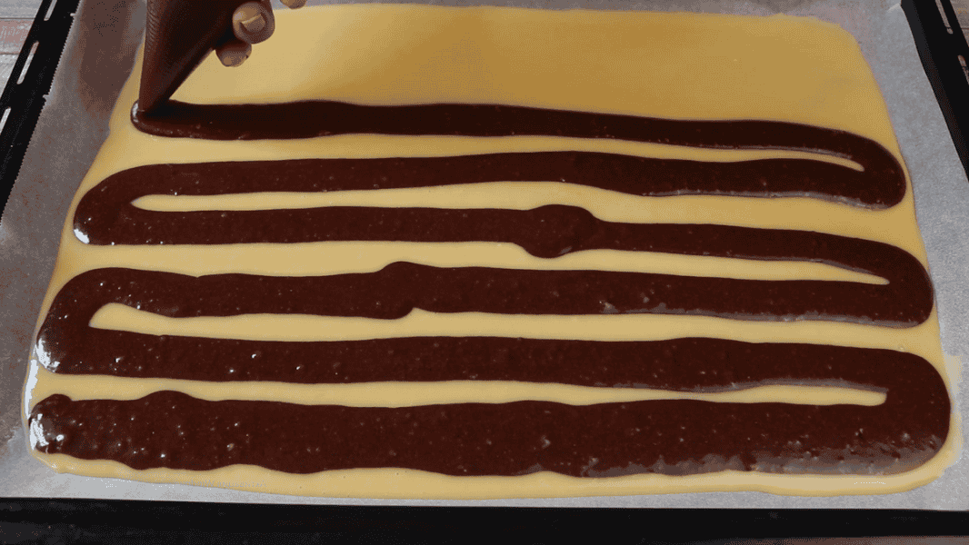 Виливаємо на деко світле тісто і розділимо його тонким шаром по поверхні. Шоколадне тісто перекладаємо в кондитерський мішок або звичайний поліетиленовий пакет. Робимо смуги з шоколадного тіста поверх світлого.