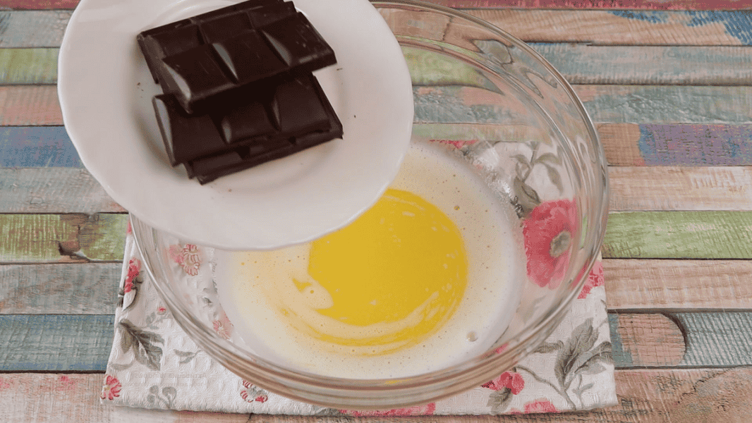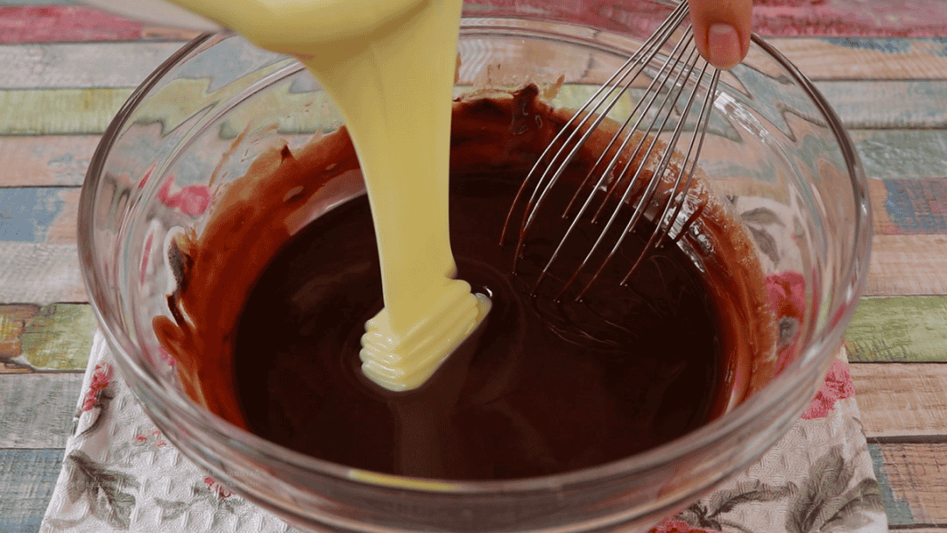 Для крему розтоплюємо 130 г вершкового масла до гарячого стану. Додаємо 100 г чорного шоколаду. Ми залишаємо на 1-2 хвилини постояти. Вимішуємо до отримання однорідної глазурі. Далі додаємо 1 банку ( 380 г ) згущеного молока кімнатної температури. Заздалегідь 2 ст. л згущеного молока я відклала для просочення коржів. Перемішуємо, глазур стала густішою. Далі додаємо 1,5 ст. л какао і перемішуємо. Миску накриваємо харчовою плівкою і ставимо крем в холодильник на 15 хвилин. Після холодильника крем буде густим.