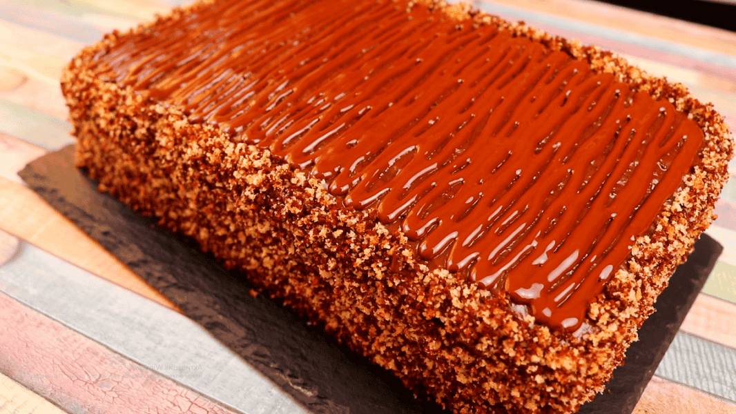 Формуємо торт. Викладаємо 1-й корж і змащуємо половиною просочення. Зверху викладаємо 1/3 частина крему і розмащуємо. Далі викладаємо 2-й корж, змащуємо його просоченням і розмащуємо ще 1/3 частина крему. Викладаємо 3-й корж, кремом змащуємо верх і боки торта. Обрізки подрібнюємо в крихту ( я це роблю в подрібнювачі ). Обсипаємо крихтою боки торта і за бажанням верх торта. Також верх торта можна полити шоколадом. Іде 50 г чорного шоколаду.