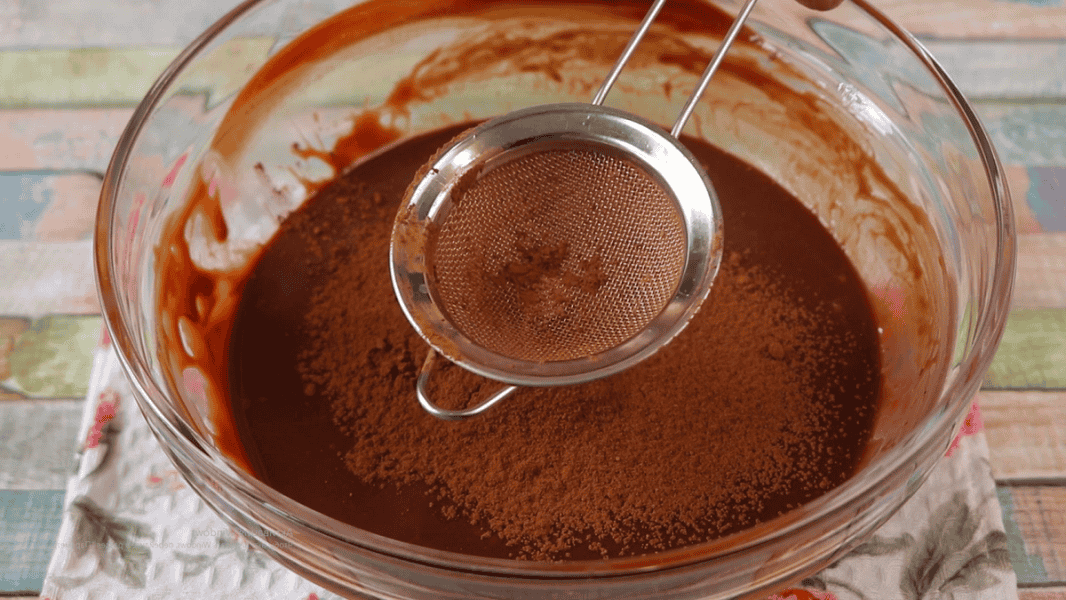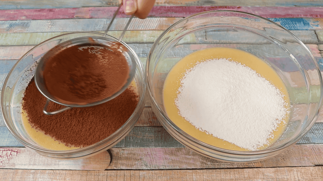 Отримане тісто ділимо на дві рівні частини. В одну миску додаємо 30 г борошна ( просіюємо через сито ) + 1 ч. л 9% оцту. У друге тісто додаємо 30 г какао. Світле тісто довго не перемішуємо, просто до однорідності. У шоколадне тісто оцет не додаємо, сода буде взаємодіяти з какао.