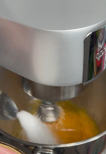 Жовтки збиваємо з щіпкої солі пару хвилин, додаємо цукор по трохи і збиваємо ще хвилин 10-15 поки маса не збільшиться в об’ємі і не посвітлішає (з моїм міксером мені вистачає і 5 хвилин, але раніше з ручним міксером у мене на це йшло хвилин 10 -12).