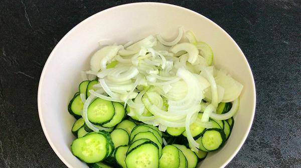 У глибоку миску кладу всі порізані огірки, цибуля і додаю сіль.