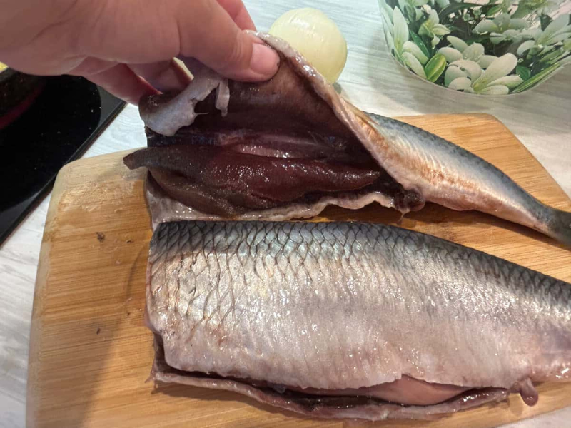 Забираю голову, очищаю від всіх нутрощів і нарізаю на порційні шматочки. Ми любимо не маленькі шматочки і я ще витягаю зі шматочків хребет і кісточки. А ось шкурочку залишаю, адже на ній самий жирок 👍.