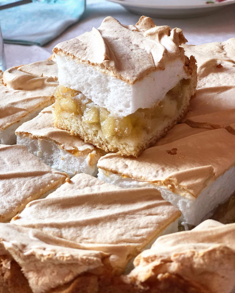 ( Р.S. ДЛЯ МЕРЕНГИ ЗБИТИ ДО ПИВНОЇ ПІНИ 3 білки, поступово додати 90 г цукру, збивати до міцних піків, далі покрити пиріг і пекти 35-40 хвилин.