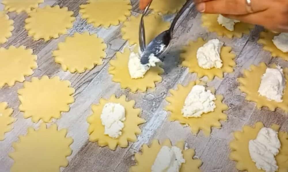 Викладіть в середину кожного кружечка 1 ч. л. начинки і защіпніть краї.