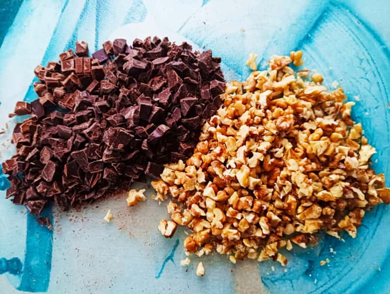 Волоські горіхи і шоколад подрібнюю ножем, щоб вийшли невеликі шматочки, а не пил. В цей кекс я додаю саме волоські горіхи. Вони м’якші, ніж мигдаль або фундук. Саме це і важливо.