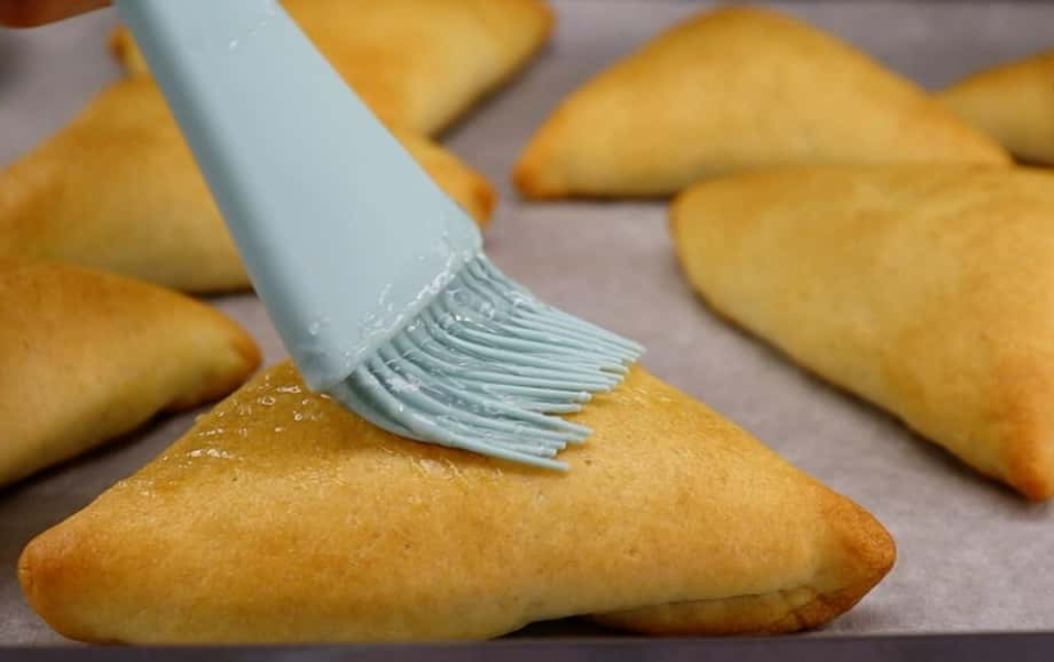 Дістаємо пиріжки з духовки та гарячі обмазуємо розведеним крохмалем. За рахунок чого випічка буде глянцевою. Повертаємо до духовки ще на 3 хвилини.