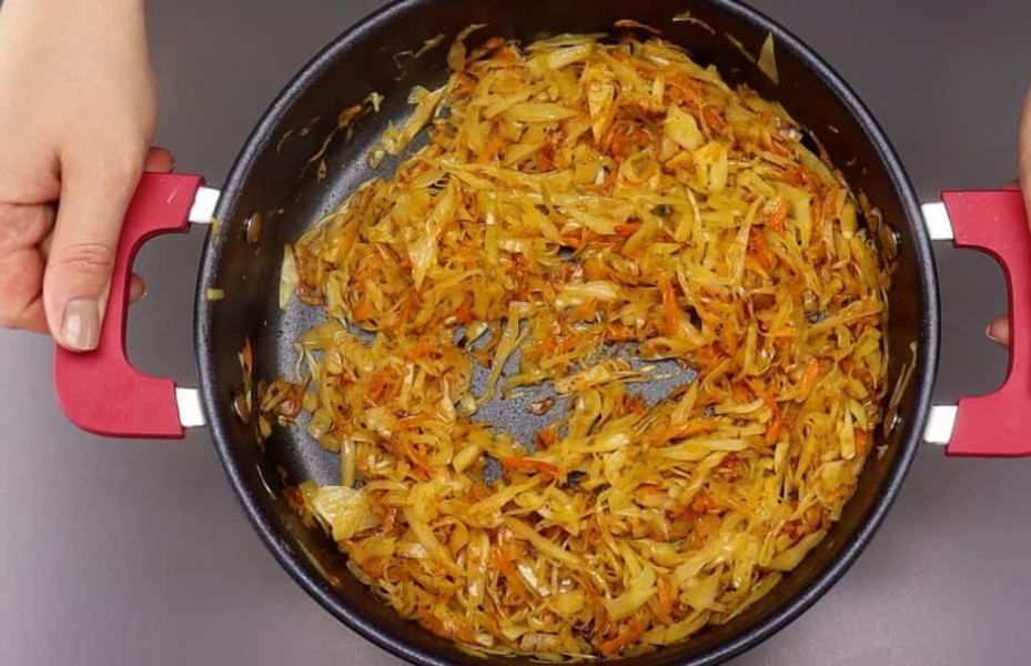 Перемішуємо овочі та тушкуємо їх до напівм’якості капусти. Тепер додаємо 1 ч. л. томатної пасти, сіль за смаком, 1 ч. л. цукру та чорний мелений перець теж за смаком. Тушкуємо овочі ще 5 хвилин, періодично помішуючи. Даємо начинці повністю охолонути.