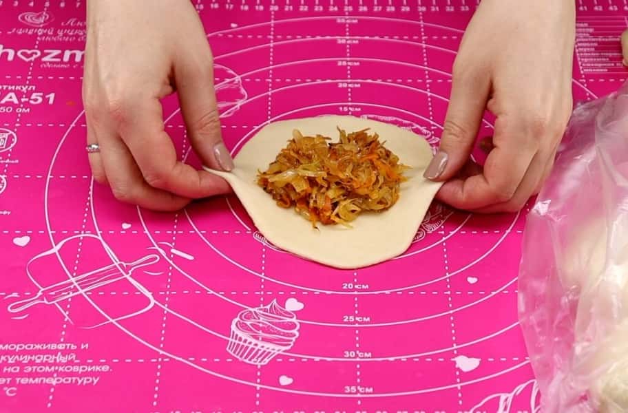 Беремо кульку тіста, злегка розгортаємо її, на центр кладемо начинку, піднімаємо 2 краї тіста вгору, з’єднуємо разом, защипуємо шов.