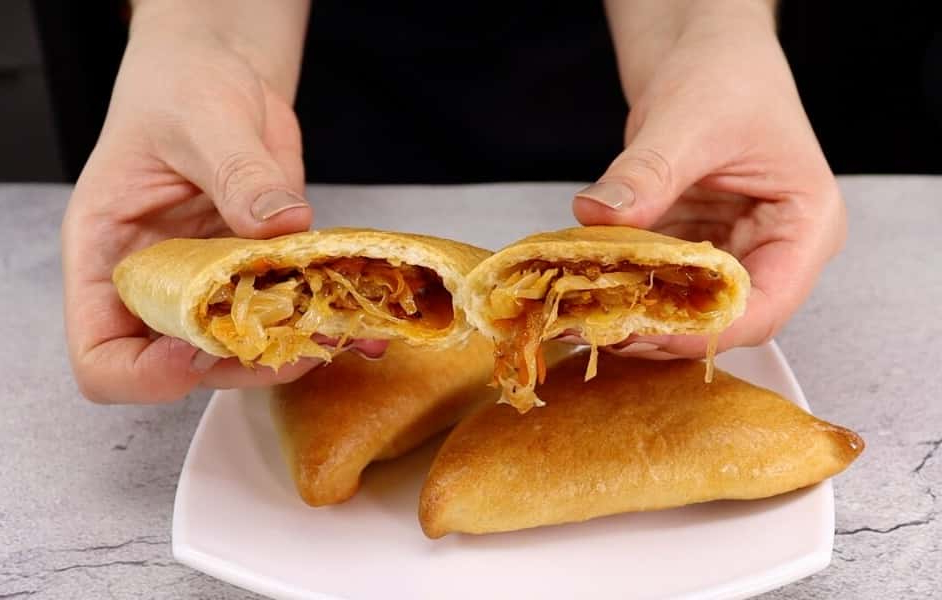 Ось тепер пиріжки готові. Вони дуже смачні, м’які, ніжні, із соковитою капустяною начинкою всередині.