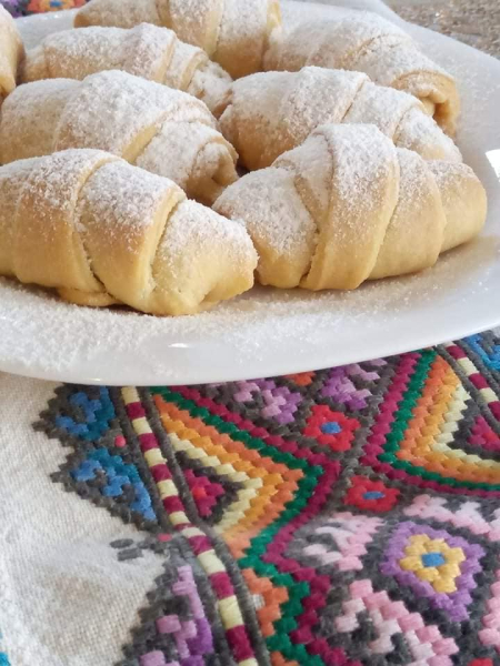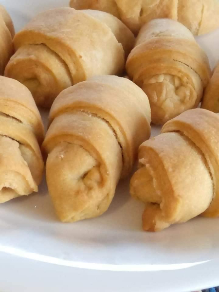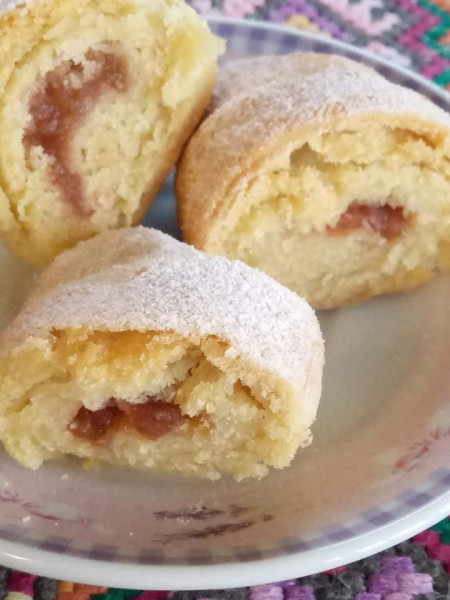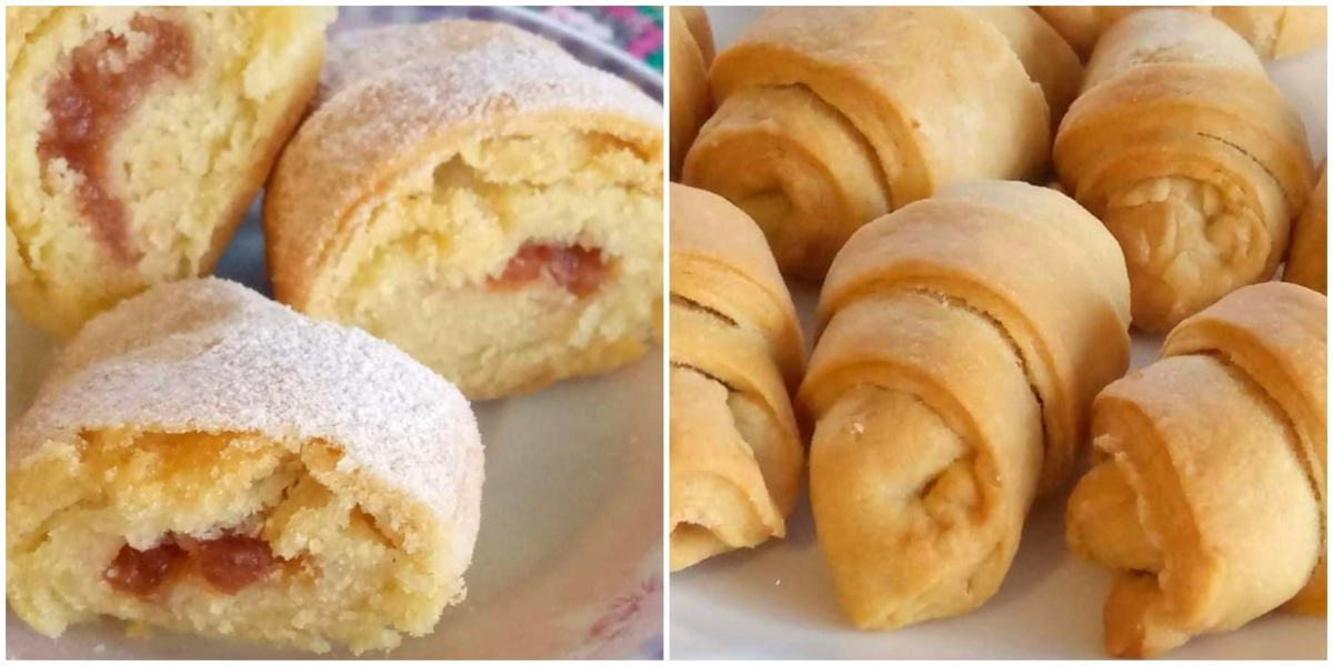 Дістати з холодильника тісто, викласти на робочу поверхню, посипану борошном, розкачати в круг, порізати на трикутники, викласти повидло я давала яблучне, та вишню заморожену, акуратно, легенько, формувати рогалики.
