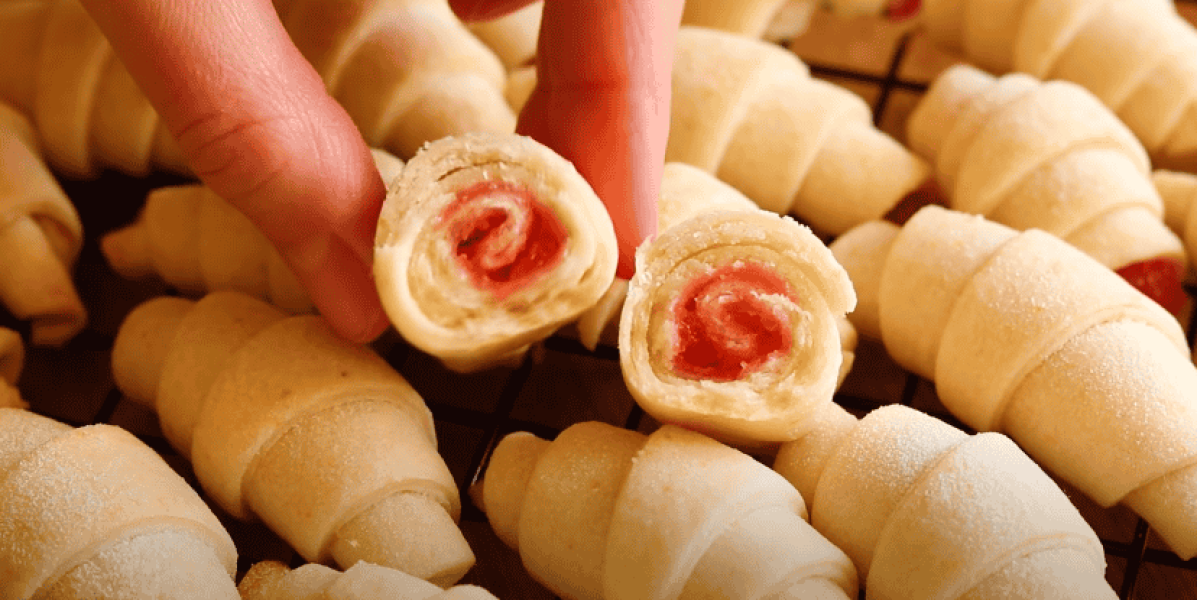 Тісто розділити на 2 частини. Розкачати по черзі коржики розділити на сигменти, викласти начинку і скрутити у рогалик.