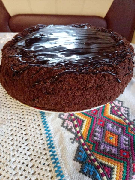 На перший корж викласти більшу частину шоколадного крему, розрівняти, потім поставити 2 корж, на верх торта крем що залишився, розподілити, на верх торта, та боки торта, прикрасити крихтою, із бісквіту, що “зрізали’ шапочку “боки торта.