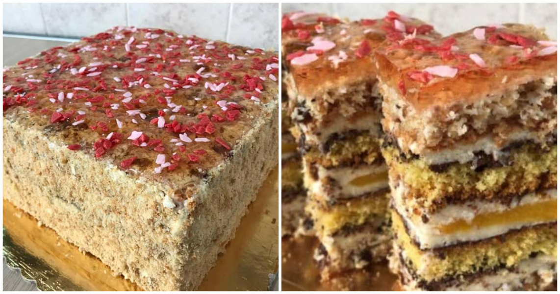 Це один з найсмачніших пляцків, які традиційно печуть на свята на Західній Україні. У ньому два види коржів з горіхами, кокосом, родзинками і шоколадом, а також дуже ніжний крем із персиками.
