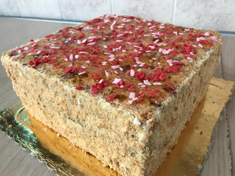 - Зібрати: горіховий корж, 1/4 крему, бісквіт в шоколаді, 1/4 крему, шматочки персика, 1/4 крему, бісквіт з шоколадом, 1/4 крему, горіховий корж (зрізаною частиною догори). Викласти зверху охолоджене желе (гелеподібної консистенції). Поставити у холодильник мінімум на 12 год, тоді він стає м’якеньким і чудово ріжеться.