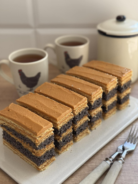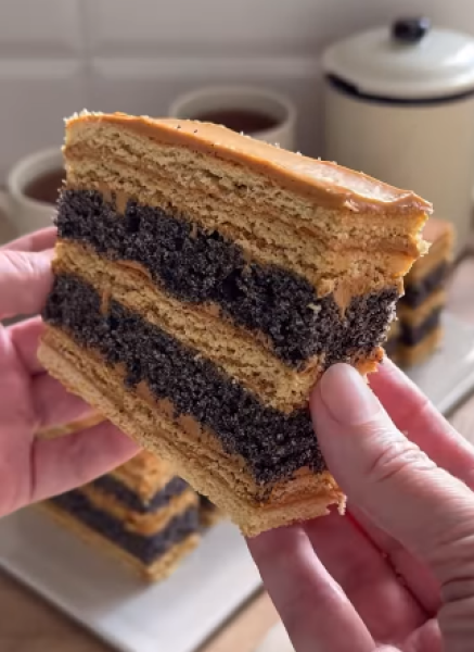Кожен корж перемастити кремом і скласти в такій послідовності: 2 медові – 1 маковий – 1 медовий – 1 маковий – 2 медових коржі. Підрівняти краї та прикрасити за бажанням. Дати настоятися. Готово).