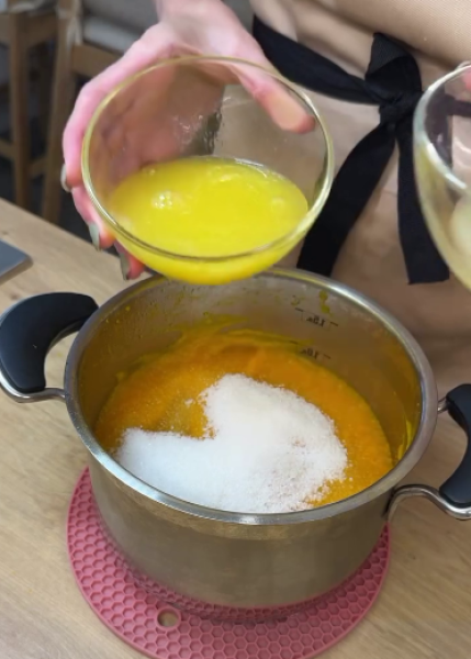 ▫️Додаємо цукор, сік лимона та апельсина, змішуємо. Помішуючи, доводимо пюре до кипіння.