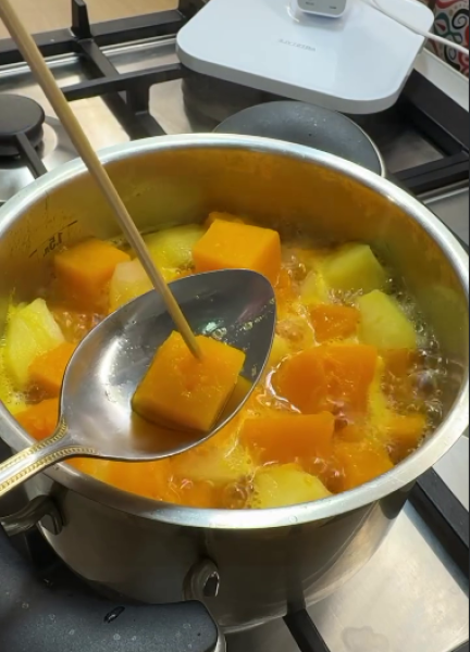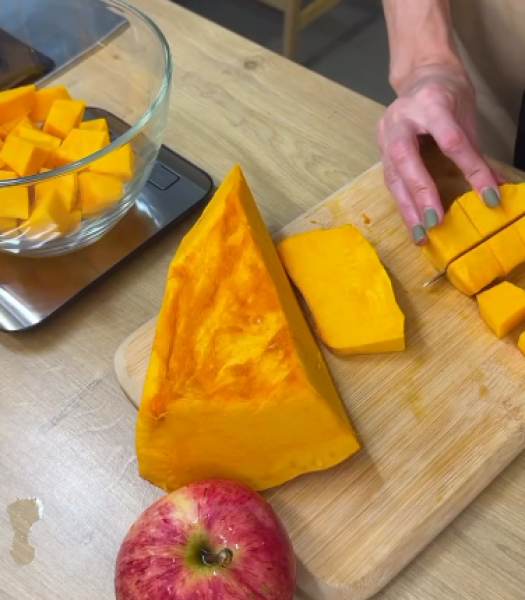 ▫️Гарбуз та яблука очищаємо, нарізаємо на кубики.