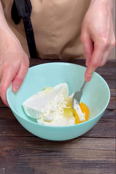 До сиру додати цукор, яйце, борошно, сіль ванілін, все добре перемішати до однорідної маси.