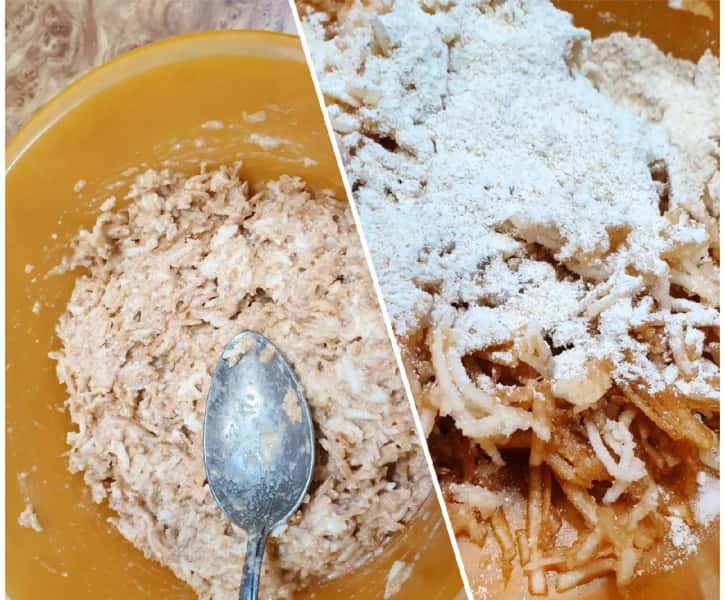 - Додати інші інгредієнти та замісити тісто. Воно густіше, ніж для капустяних оладок.