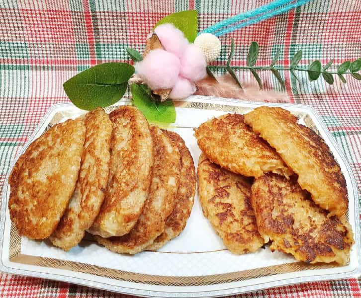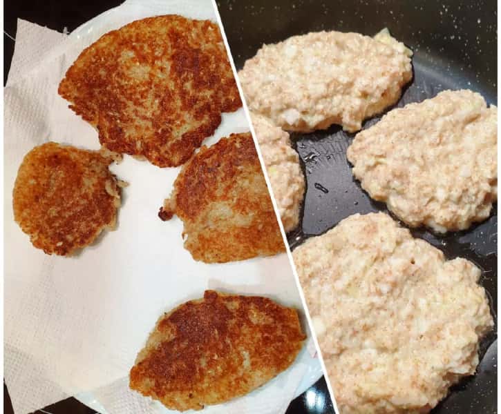 На фото яблучні ліворуч, капустяні праворуч. З вказаної кількості інгредієнтів виходить приблизно 12 капустяних оладок та 6 яблучних.