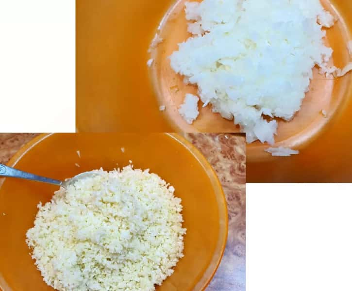 - Капусту і цибулю дуже дрібно порізати або пробити блендером.