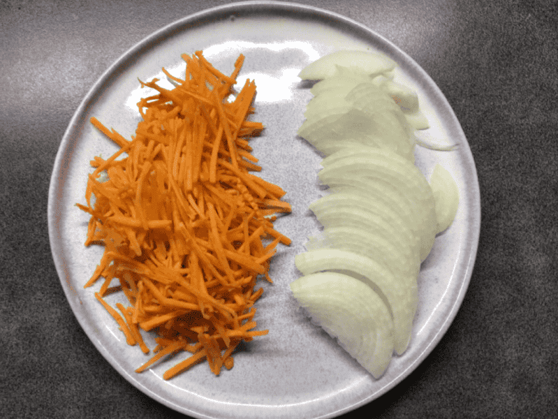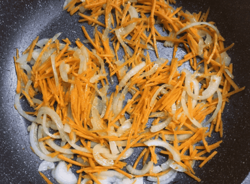 Приготуємо начинку. Моркву натерти на тертці для корейських салатів. Цибулю нарізаємо півкільцями.