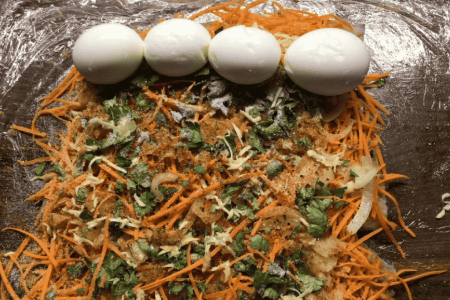 Потім розкладаємо начинку. Цибуля, морква, зелень, а потім яйця. Посипаємо часником.
