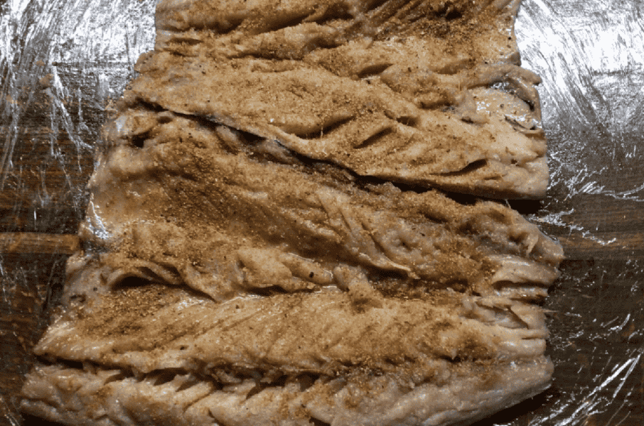 Видаляємо всі начинки і чорну плівку на внутрішній поверхні риби. Розкладаємо обидві риби в “нахльостку”. Обов’язково треба посолити, поперчити та посипати сухим желатином.