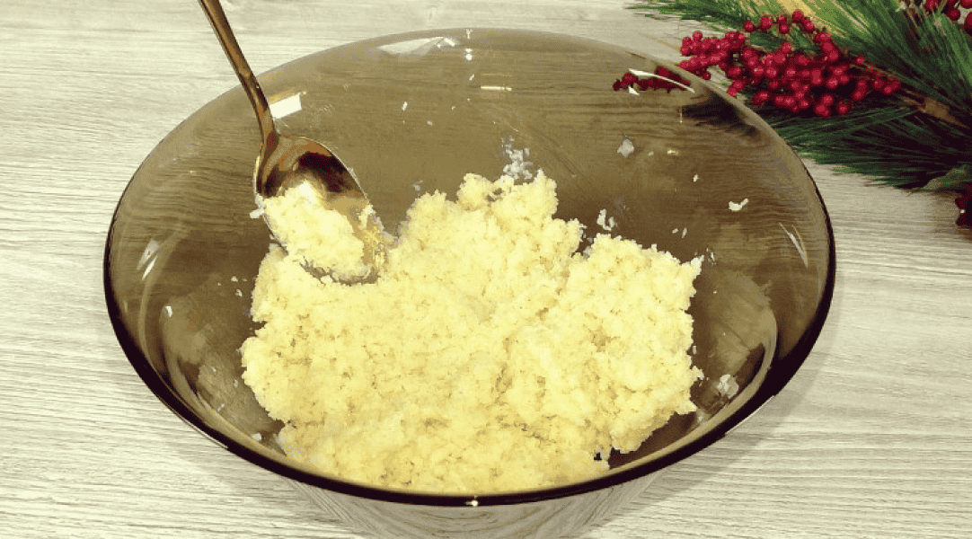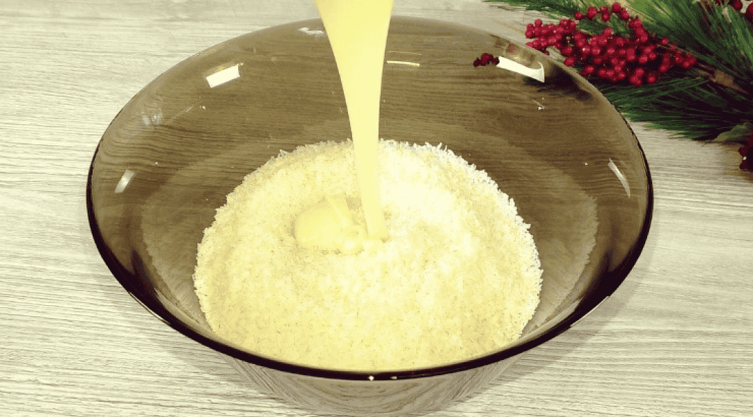 2. У кокосову стружку додаю згущене молоко, в три заходи, нам треба отримати масу, яка добре тримає форму і не розсипається.
