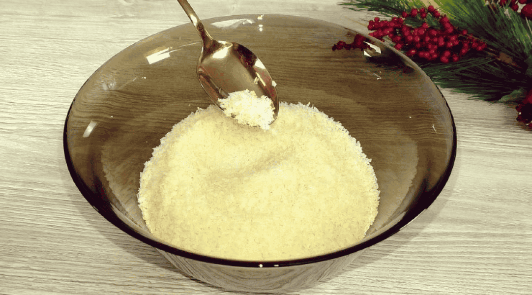 - Основою рецепту буде кокосова стружка. Я зазвичай для рецепту використовую 200 г, готових цукерок виходить приблизно 40 шт., вагою від 16 до 20 г.