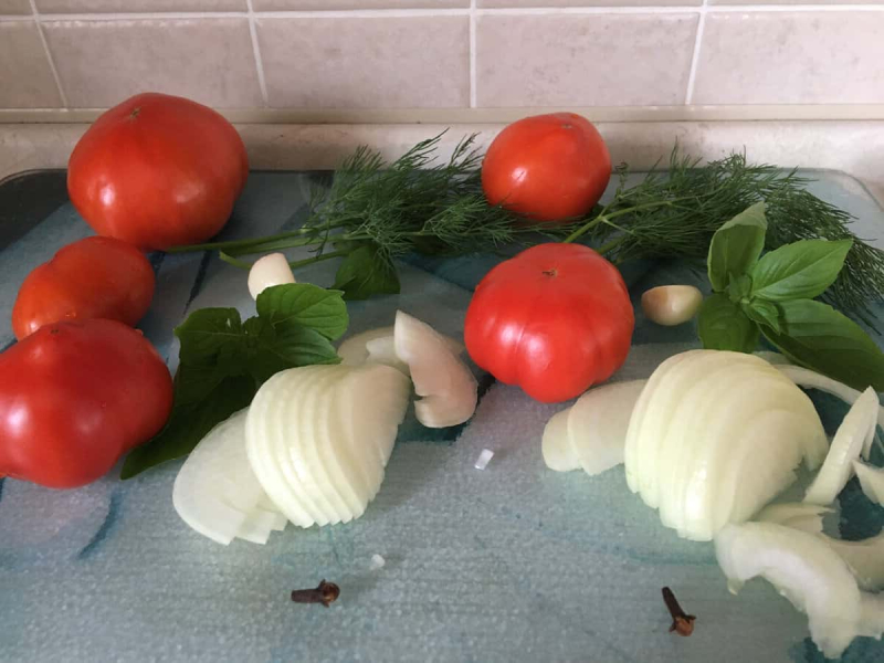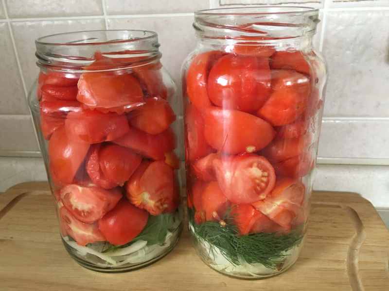 На дно банок укладаю зелень, часник, цибулю і гвоздику. Помідори нарізаю на часточки і заповнюю банки, ущільнюючи ложкою, але не деформуючи помідорні часточки.