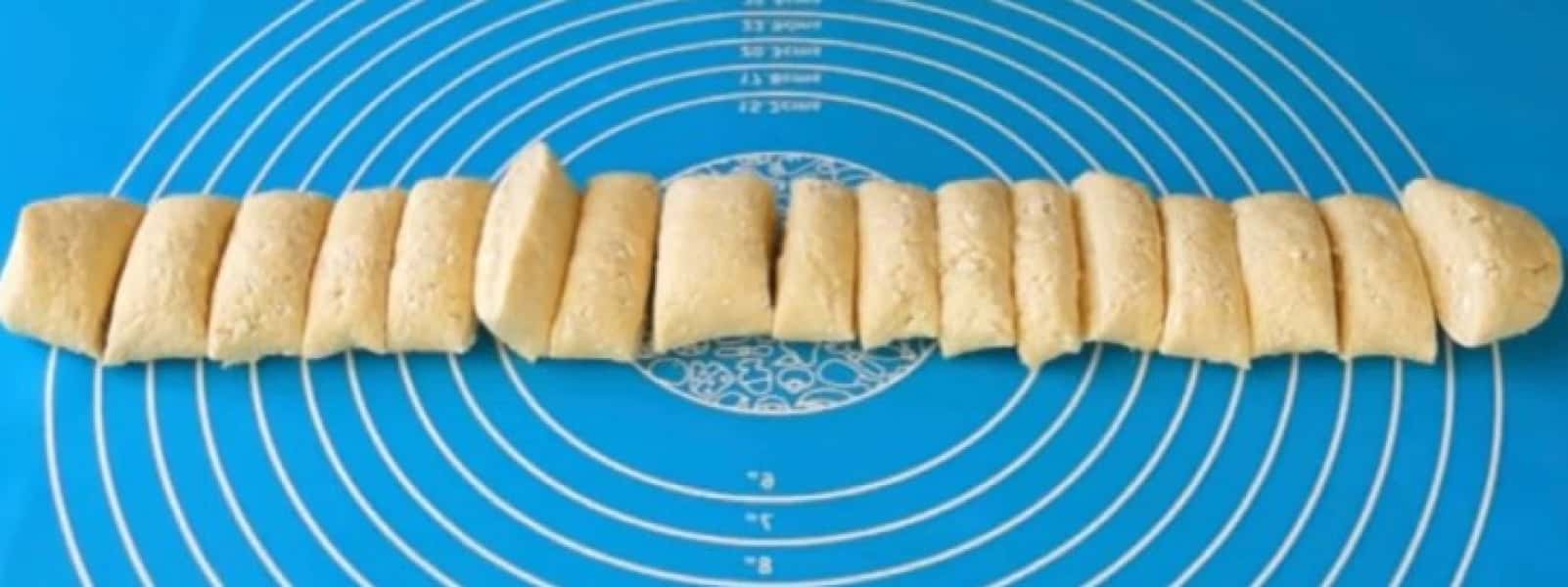 Розкачуємо тісто в ковбаску і нарізаємо на маленькі шматочки.